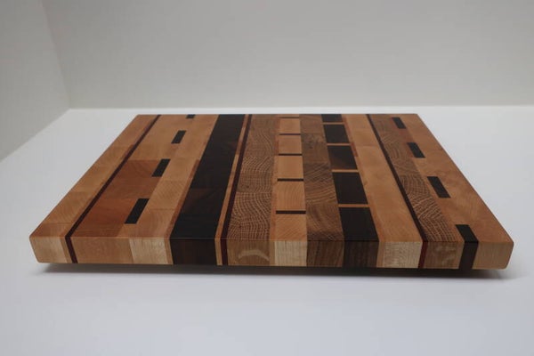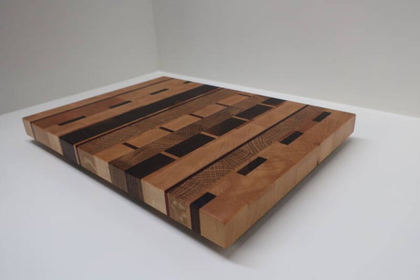 Snijplank kopshout gemaakt van meerdere houtsoorten waaronder eik, beuk, esdoorn, padoek en walnoot.